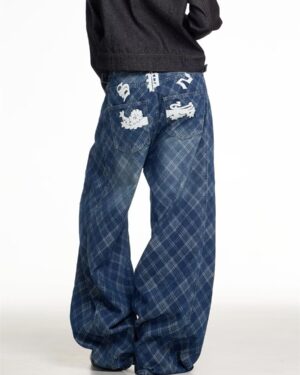 Plaided Baggy Back Patched Jeans